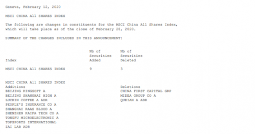 Msci调整 - 套利机会来了?MSCI指数8月季调结果出炉,这些股票新"入群"! / 2月13日,msci季度调整结果显示,msci中国全流通指数(msci china all shares indexes)中,将会有9家新增成分股公司,其中市值前三大公司包括京沪高铁,中国人保和金山办公,